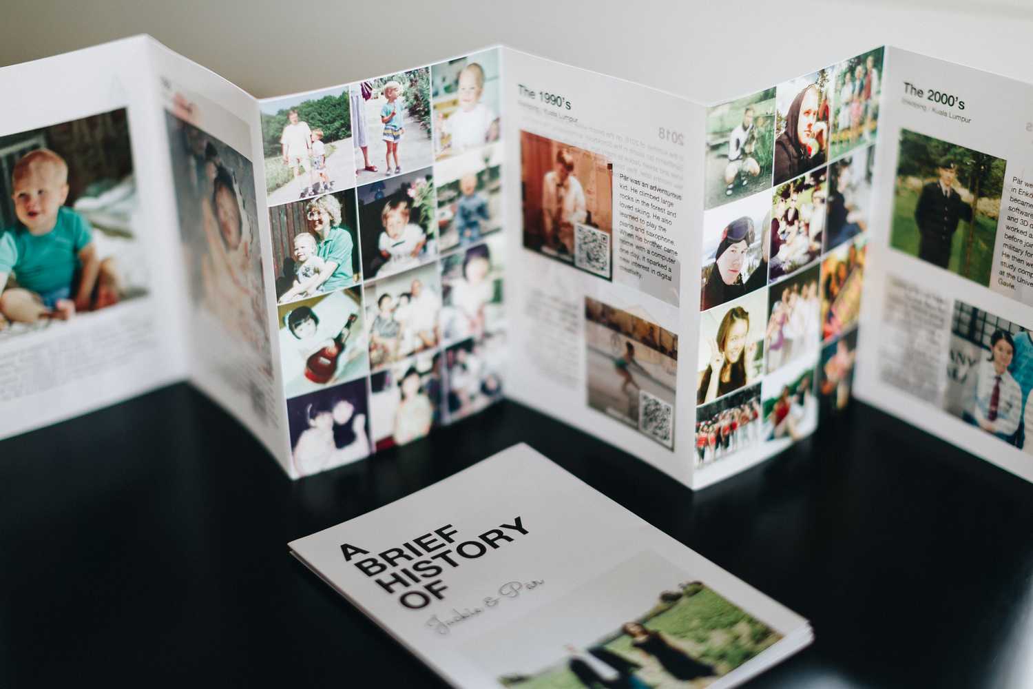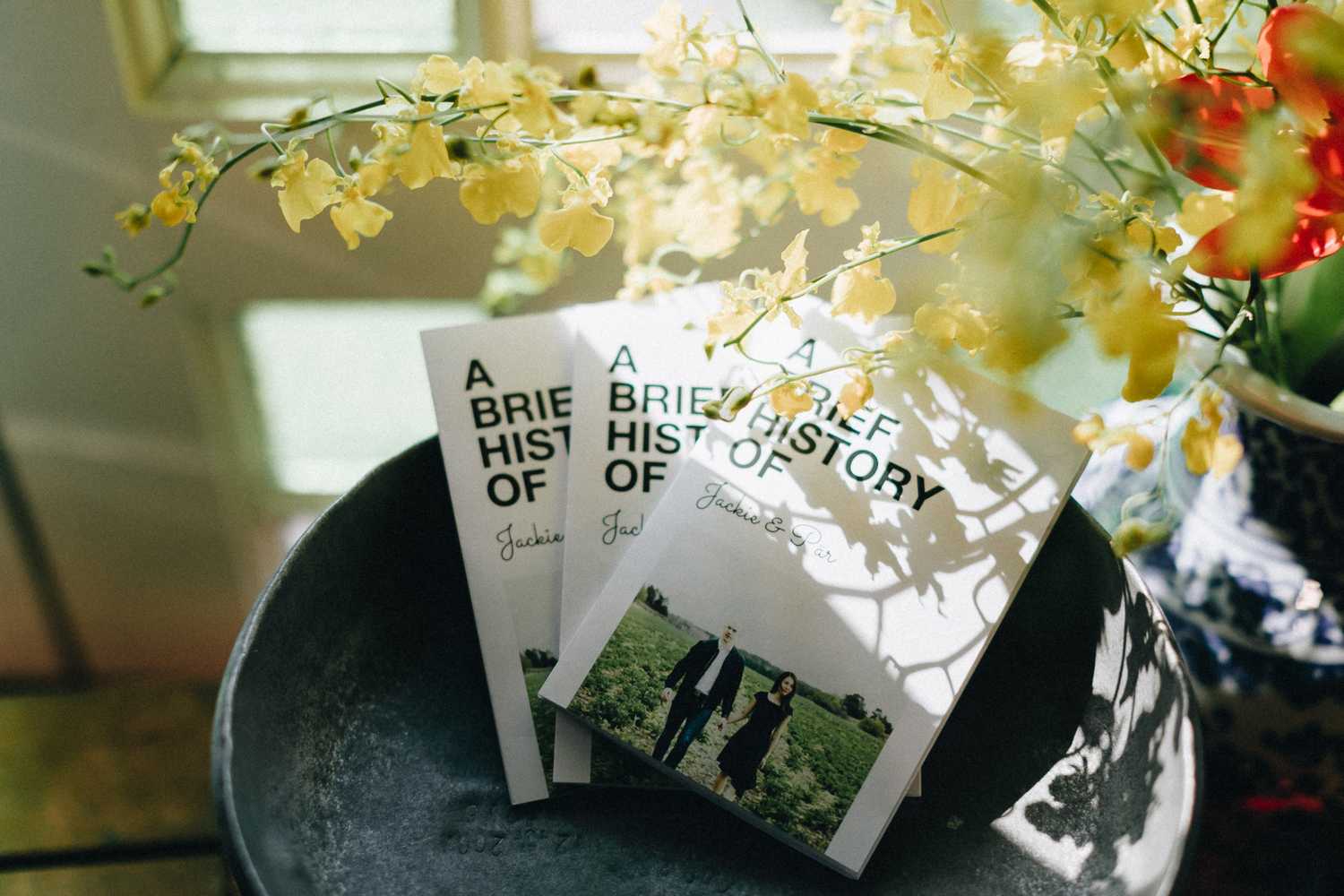 As the team hustled and fussed about the delicate yellow dancing ladies and sprigs of blush Chinese peonies in the midst of a nostalgic display of childhood photos, we were drawn to an adorable A Brief History Of booklet that told the story of Jacqueline and Par and everything in between.