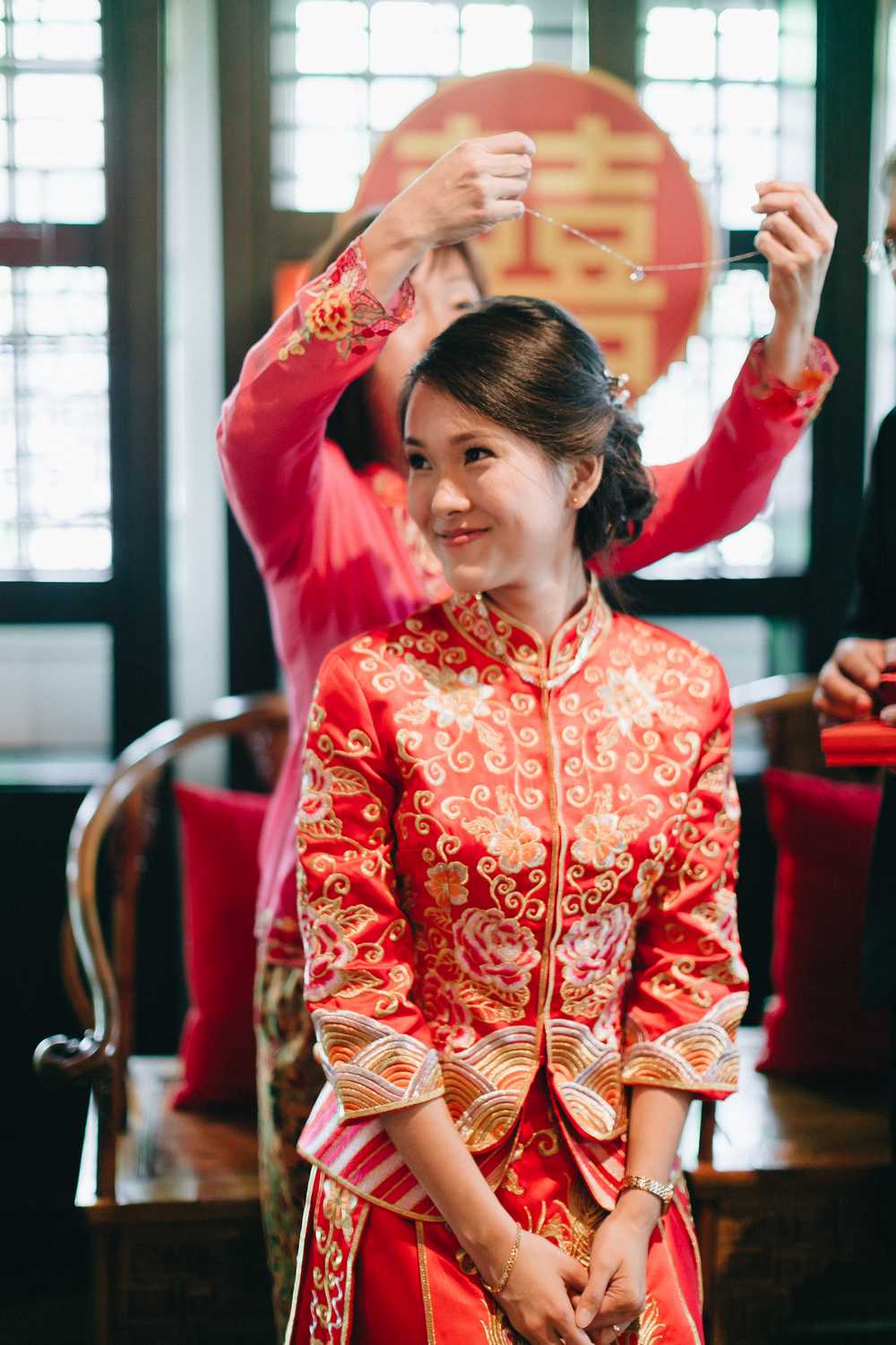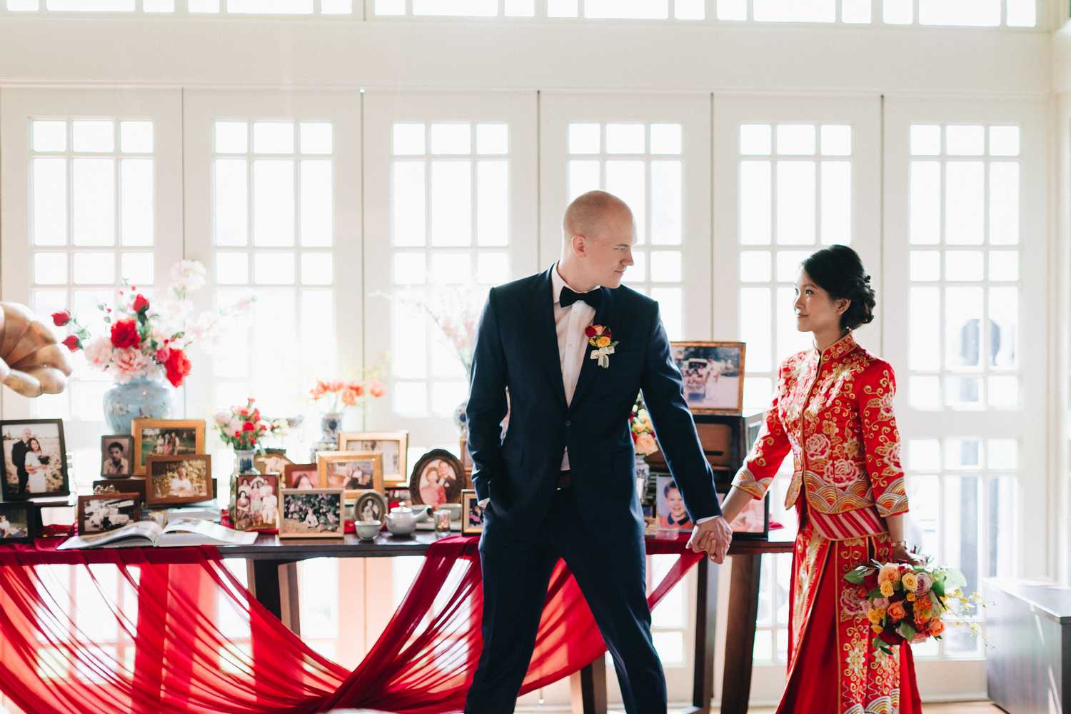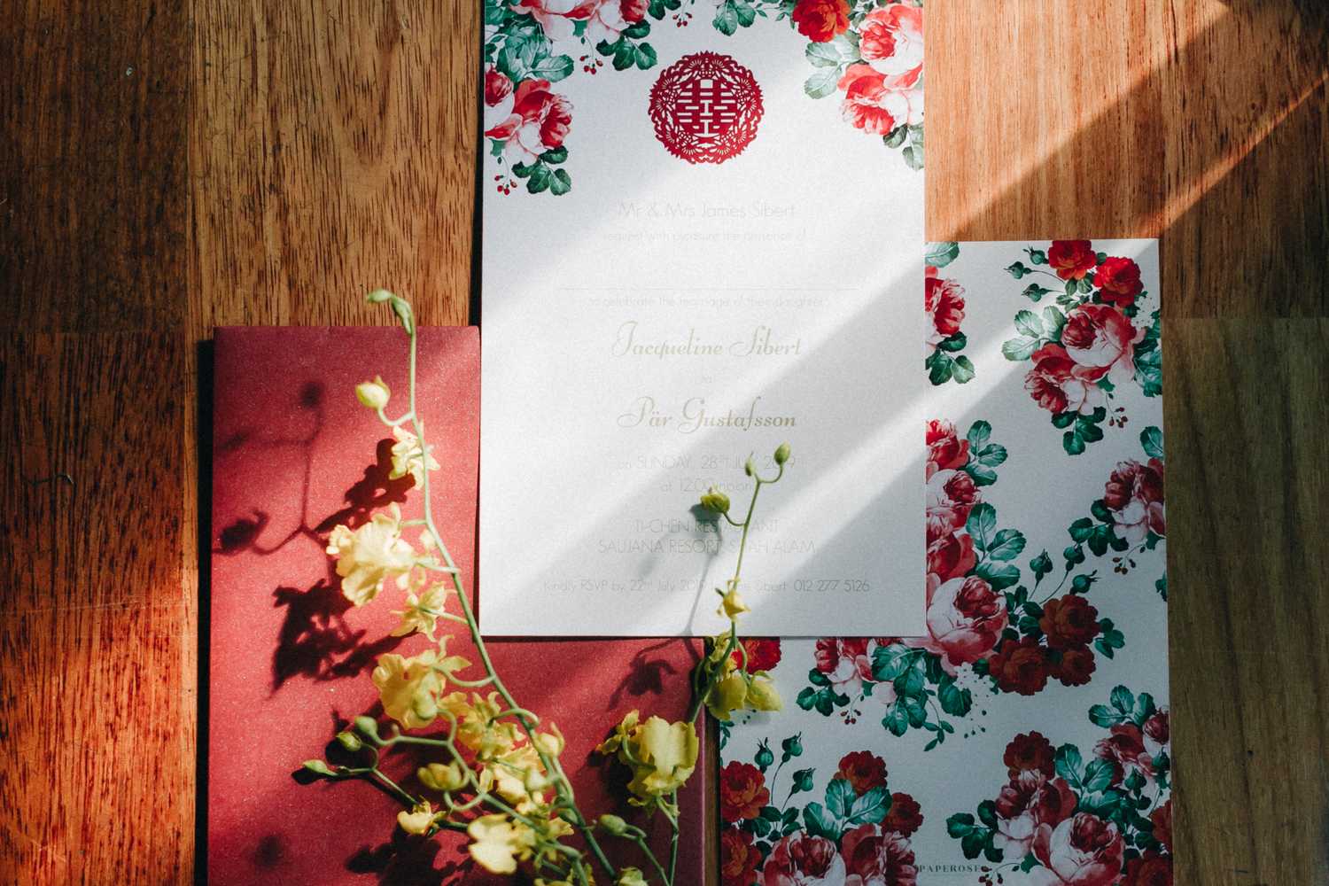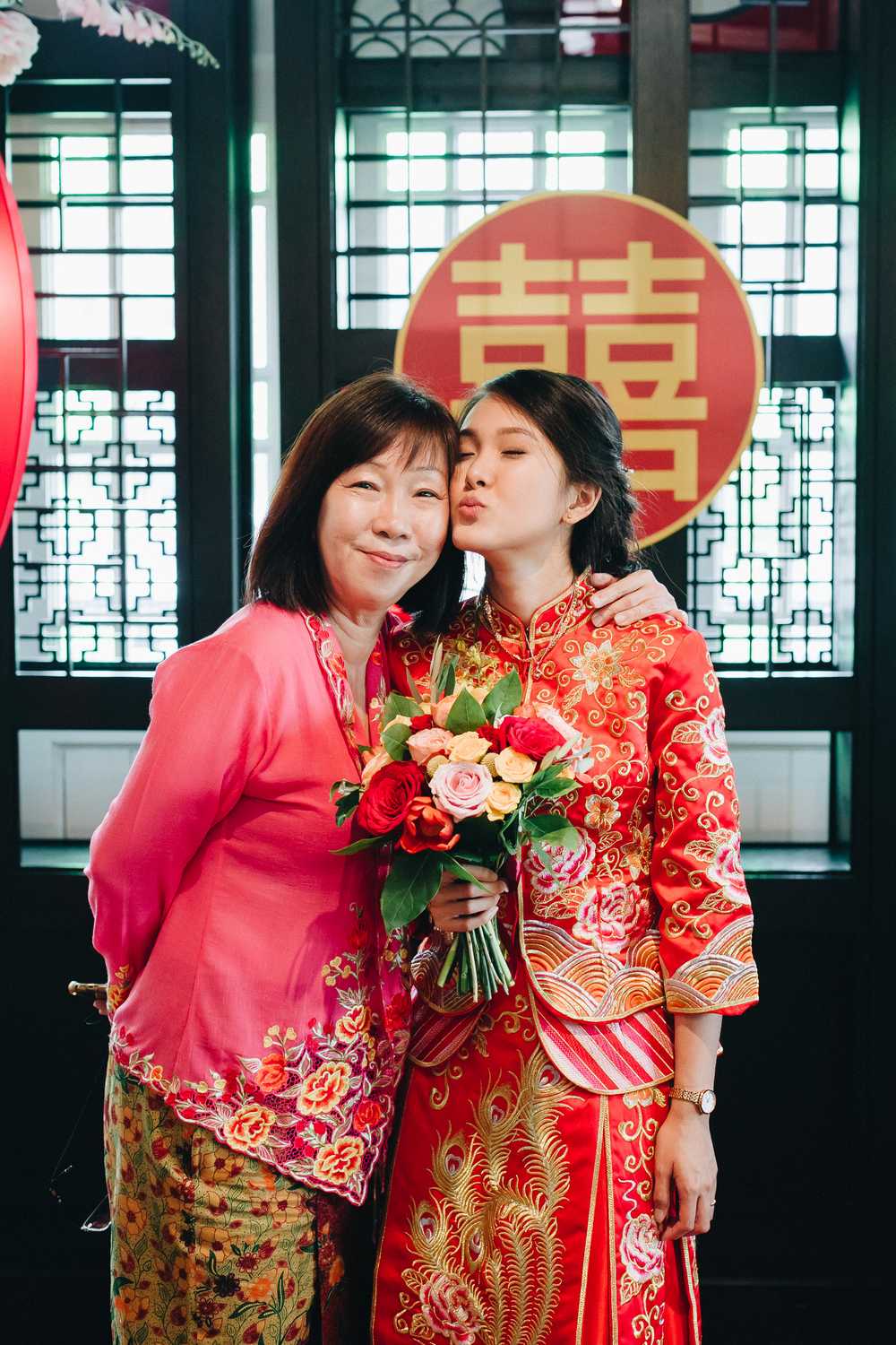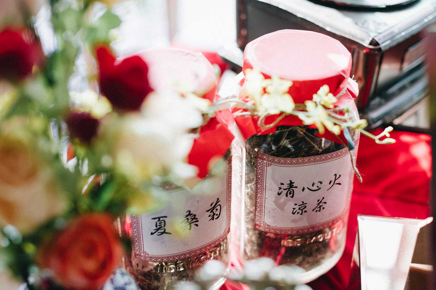 Ti-Chen’s space was transformed into an exquisite oriental atmosphere, injected with Peranakan elements that fused the vibrant tones of the Kebaya tops the women donned on and bright hues that stood out from the red and yellow floral blooms all around. We were blessed to have the most amazing natural light that elevated the entire space, casting a radiant and somewhat magical glow to the already-existing heartwarming ambience where Jacqueline and Par carried out their tea ceremony.